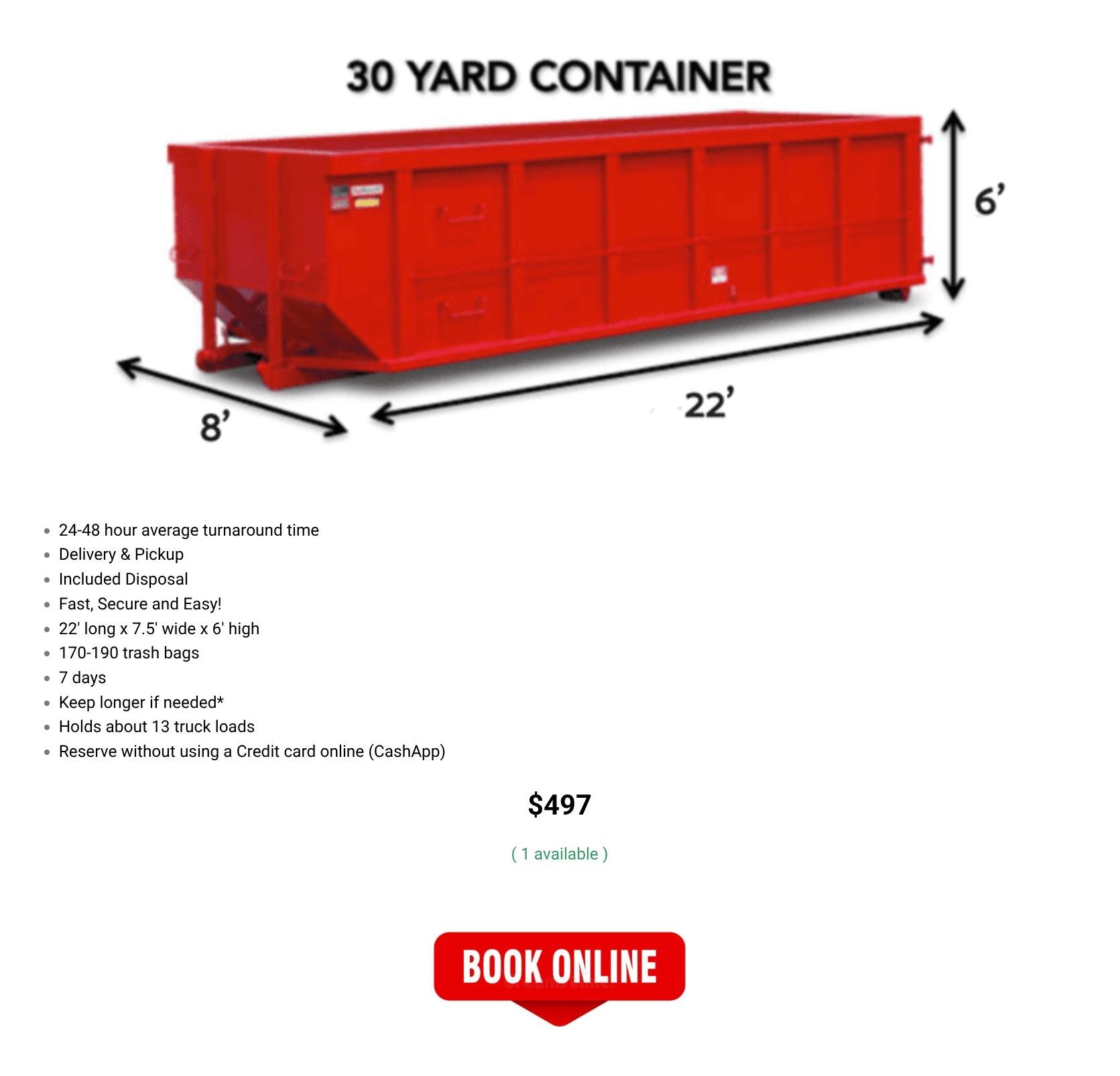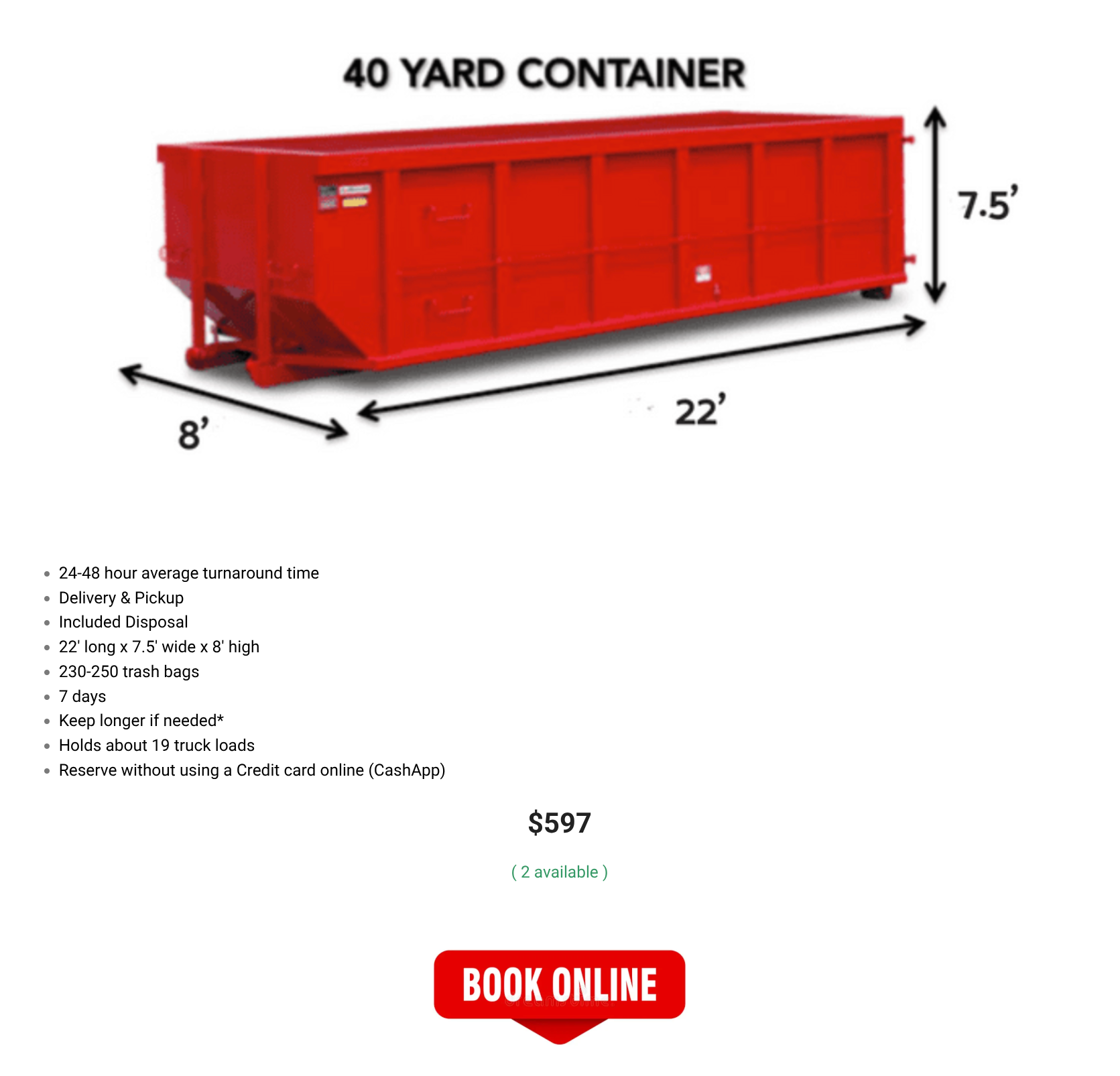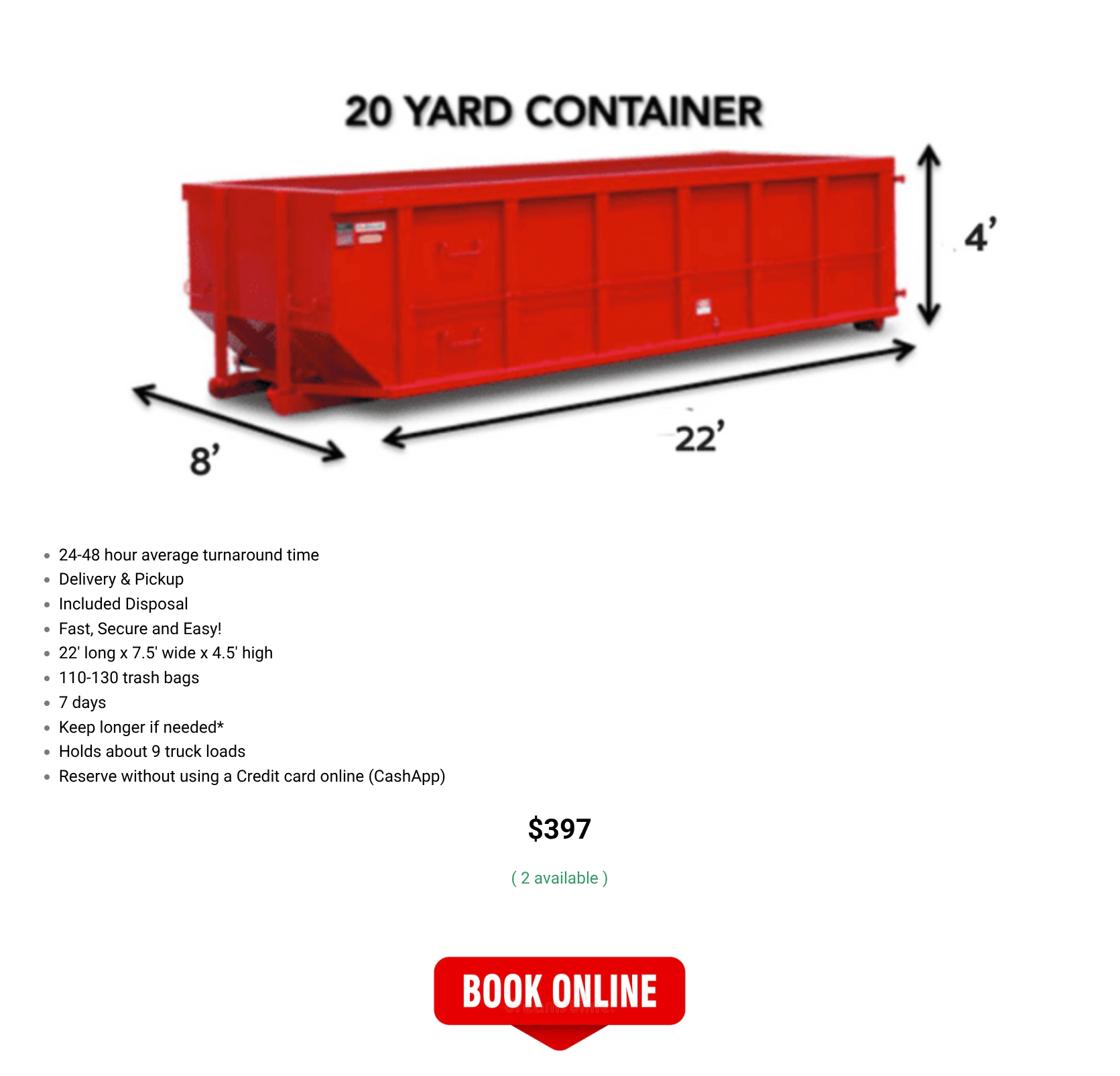 The size of the dumpster depends on the volume of waste you expect to generate. Generally, smaller projects like home cleanouts or small renovations may require a 15 or 20-yard dumpster, while larger construction projects might need a 30 or 40-yard dumpster. Our team can assist you in choosing the appropriate size based on your project details.